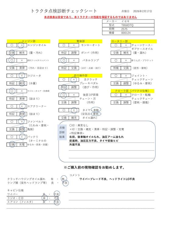 | 農機種別 | トラクター | 備考 | ・現状有姿での販売となり、保証はございません。中古機械の現状渡しにつき、ノークレーム・ノーリターンでお願い致します。できる限りの情報を掲載しておりますが、購入後のトラブル防止のため、現物確認をお勧めいたします。物件引渡し後はノークレームノーリターンとなります。物件引渡し後の減額や返品対応はできません。以上をご理解いただいた上でご購入をお願い致します。 ・店頭および各種販路でも販売しているため、出品を取り消すことがございます。予めご了承ください。 ・保管場所は埼玉県になります。 (※ご来店は完全予約制です。お越しの際は事前に必ずご連絡ください。) |