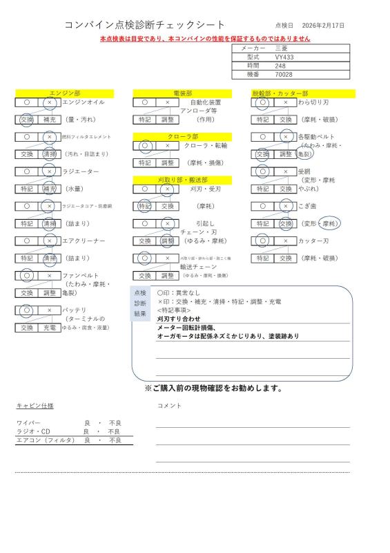 | 農機種別 | コンバイン | 備考 | ・現状有姿での販売となり、保証はございません。中古機械の現状渡しにつき、ノークレーム・ノーリターンでお願い致します。できる限りの情報を掲載しておりますが、購入後のトラブル防止のため、現物確認をお勧めいたします。物件引渡し後はノークレームノーリターンとなります。物件引渡し後の減額や返品対応はできません。以上をご理解いただいた上でご購入をお願い致します。 ・店頭および各種販路でも販売しているため、出品を取り消すことがございます。予めご了承ください。 ・保管場所は埼玉県になります。 (※ご来店は完全予約制です。お越しの際は事前に必ずご連絡ください。) |